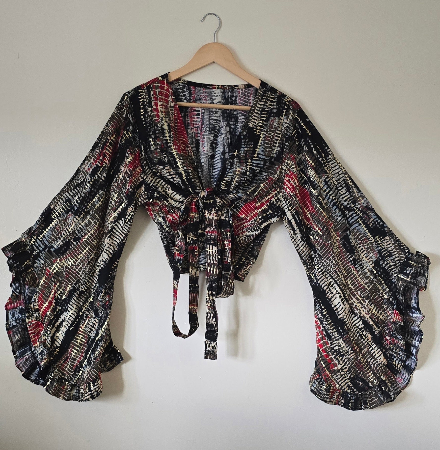 Our Lily of the Incas Wrap Crop Top are flowy, whimzy, full of charm, elegance, it's a statement piece. Crafted in Indian Rayon, with a low cut V neckline and a long tie in front closure creating a flattering, relaxed free spirited style. The bell witchy flared sleeves with the ruffled details are dreamy with graceful movements. You can style it layered with a flare trouser and top, skirts, or on top of a flowing dress, alone or as a top. wear it wrapped around and tied at the back or tie in a beautiful bow at the front. It's the most perfect boho picture for winter to summer.