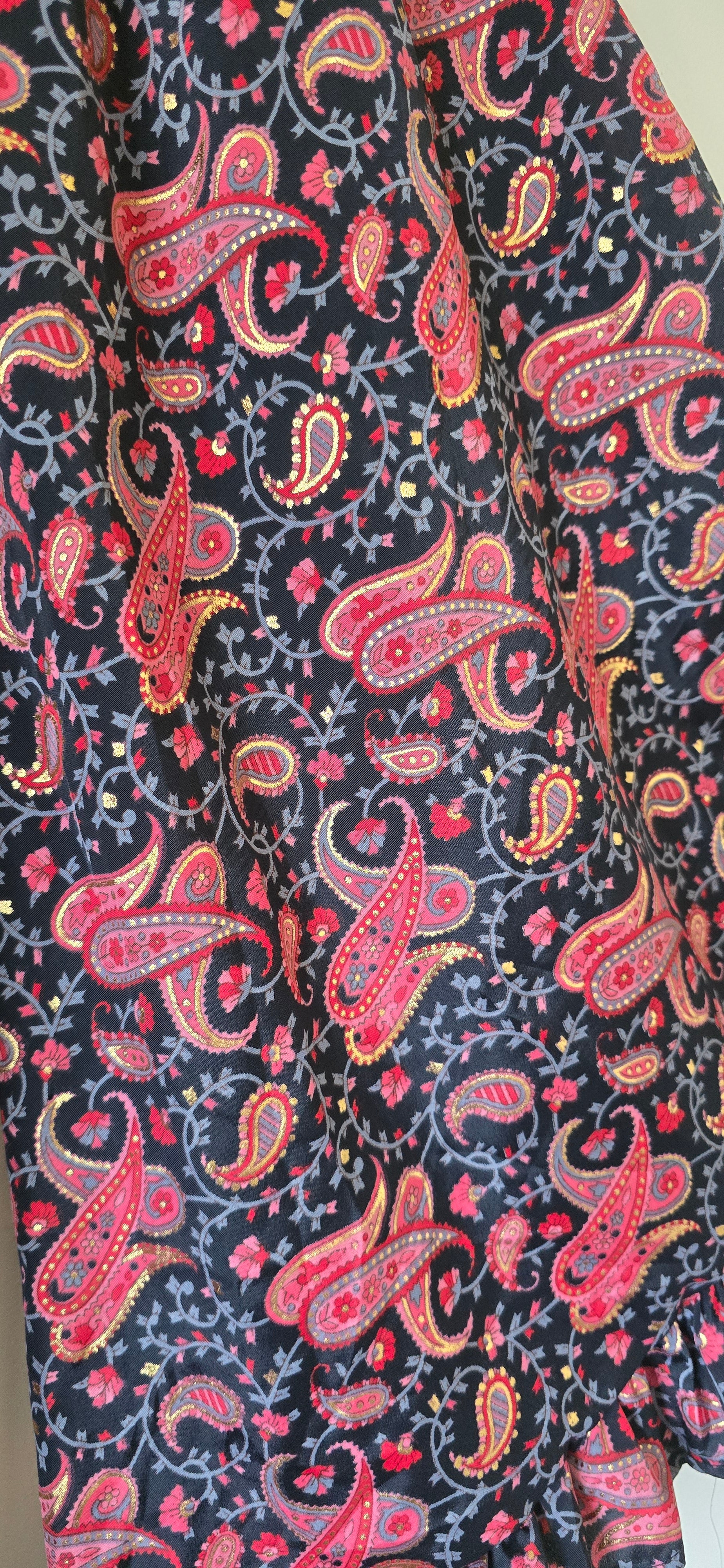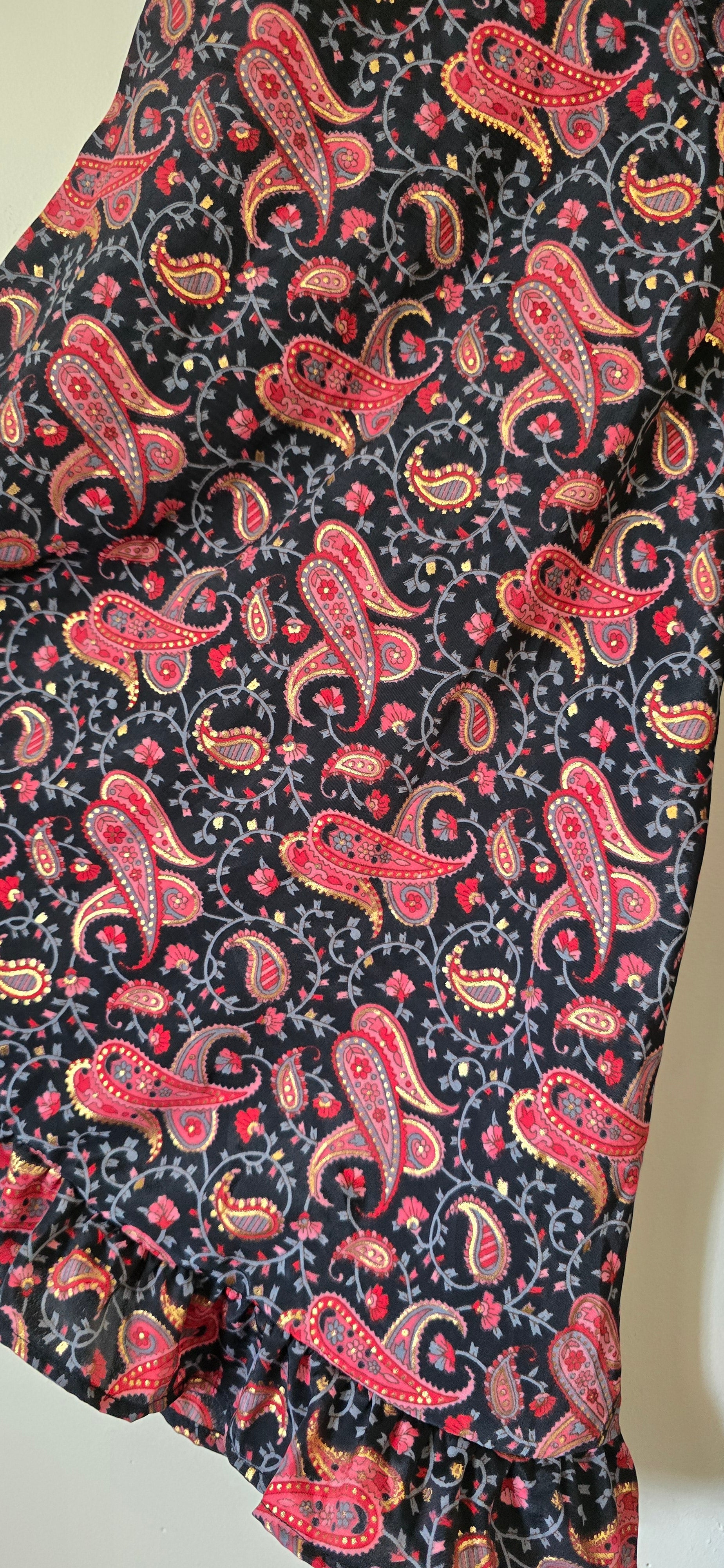 Transform your bohemian style with the Piece of My Heart Kimono, a stunning oversized piece crafted from silk saree fabric in a serene sunset hues of earth and reds with paisleys printed. This kimono is adorned with intricate shimmering speckles of gold details that catch the light with every movement. Designed for a relaxed, flowing silhouette, our Piece of My Heart Kimono adds a touch of magical elegance to any outfit. Perfect for layering over casual wear or evening dress up, this piece brings an ethereal, hippie, elegant vibe to your wardrobe. The soft, cool, lightweight silk saree fabric makes it ideal for transitioning between seasons with grace and style just like a Goddess!